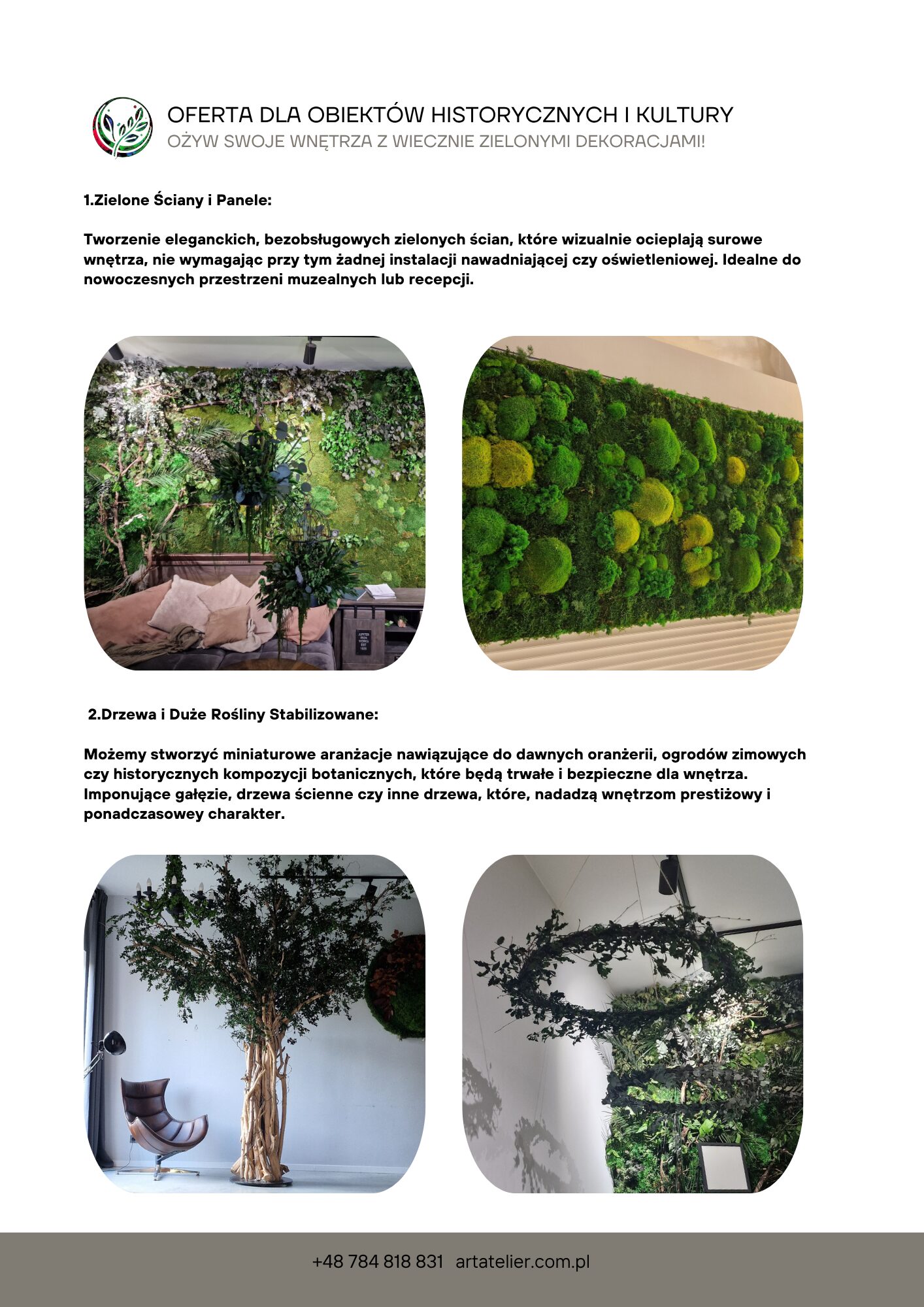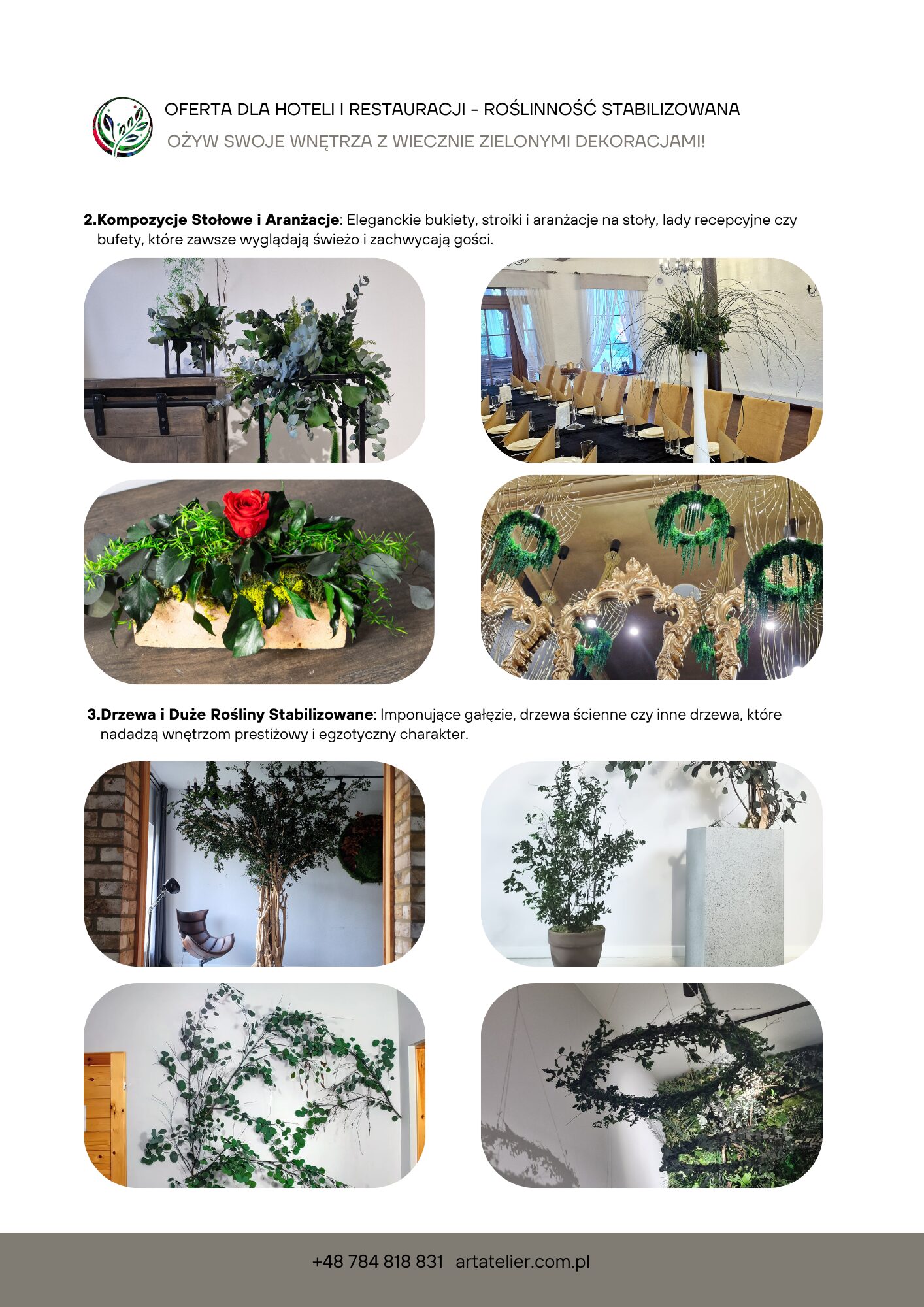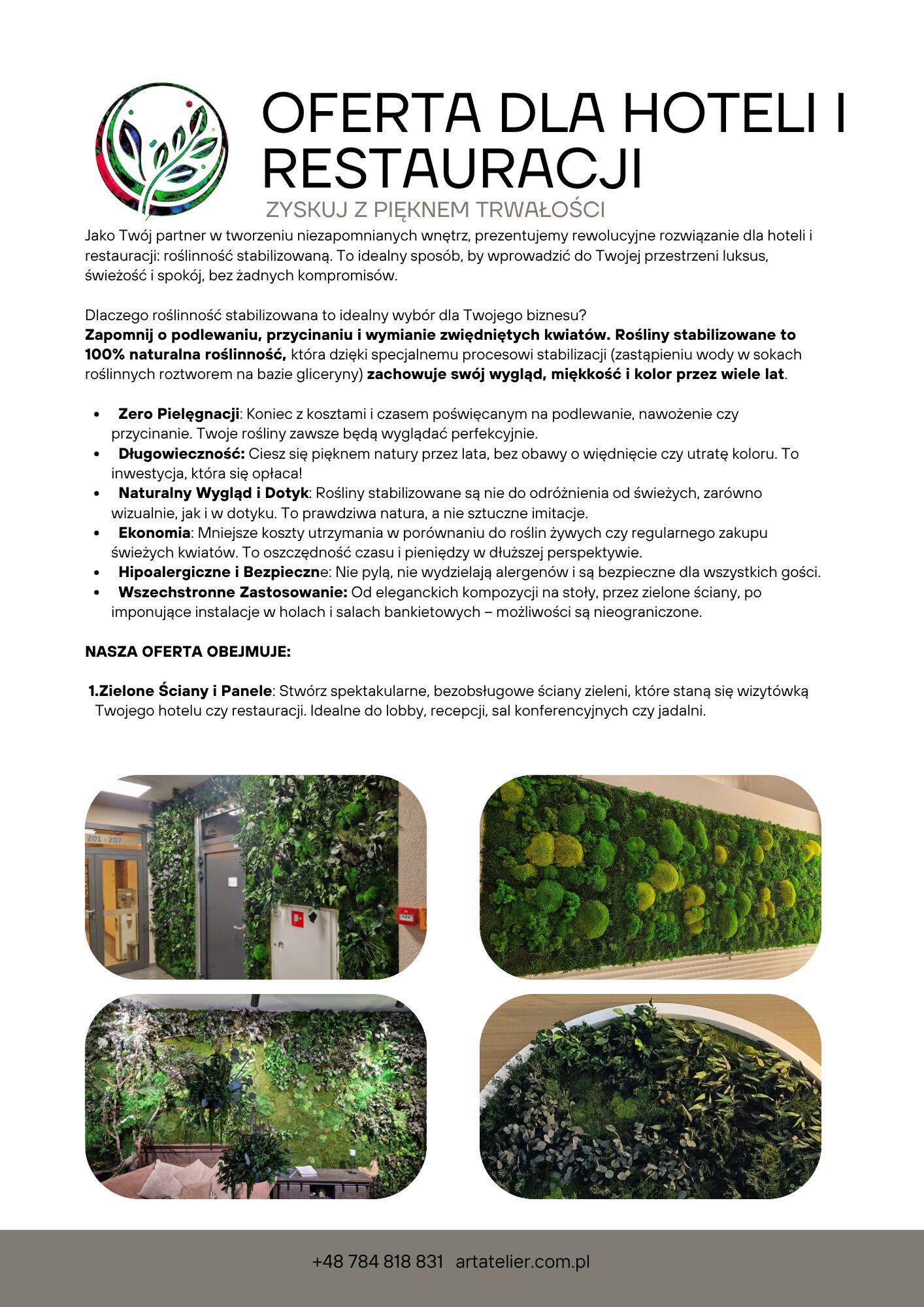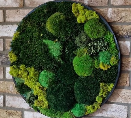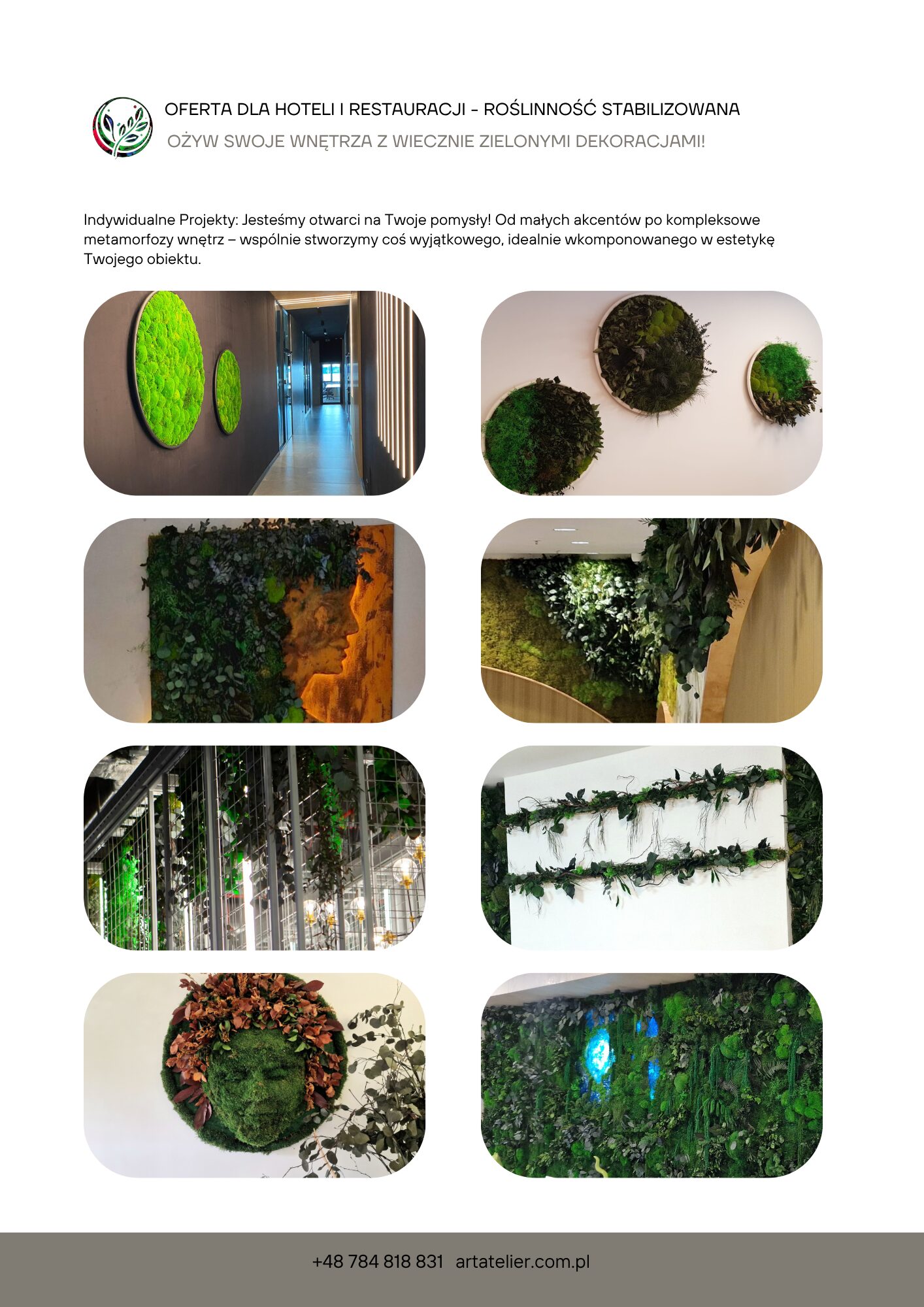 Obrazy z mchu, panele i logotypy z roślin stabilizowanych przyciągają wzrok i budują tożsamość miejsca. Kontrasty kolorystyczne, różne faktury mchu i liści pozwalają tworzyć dekoracje od subtelnych po bardzo wyraziste.