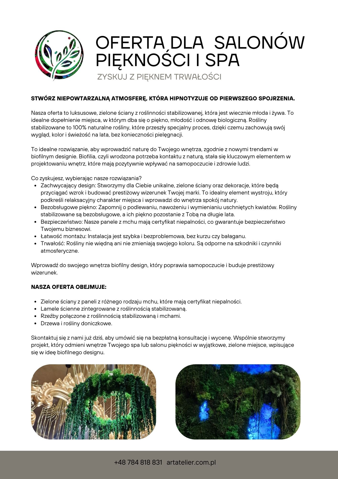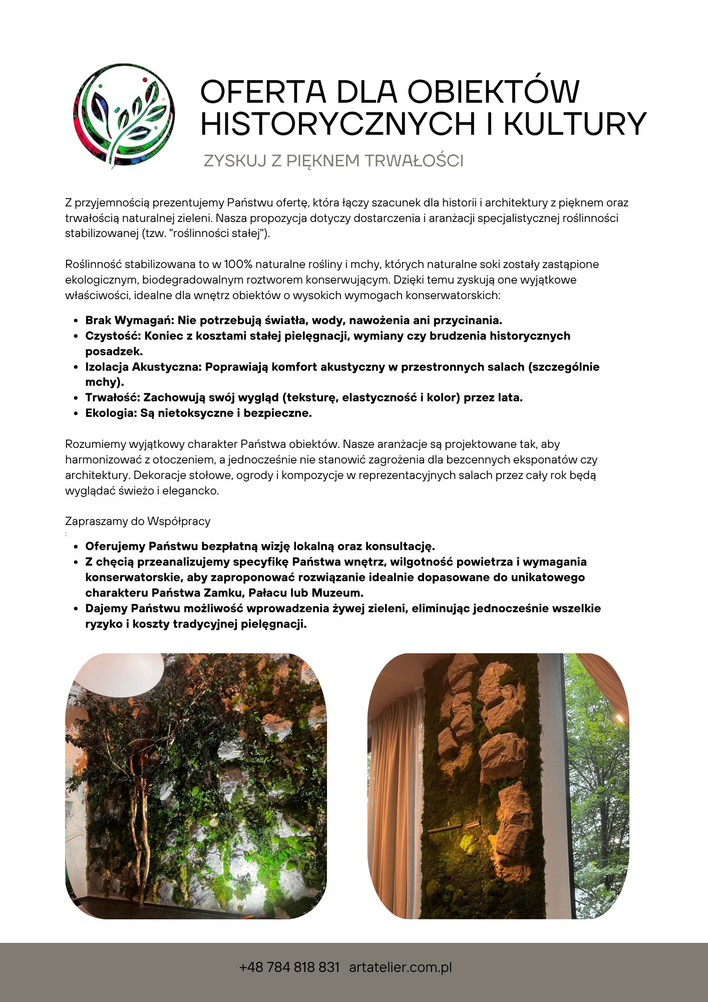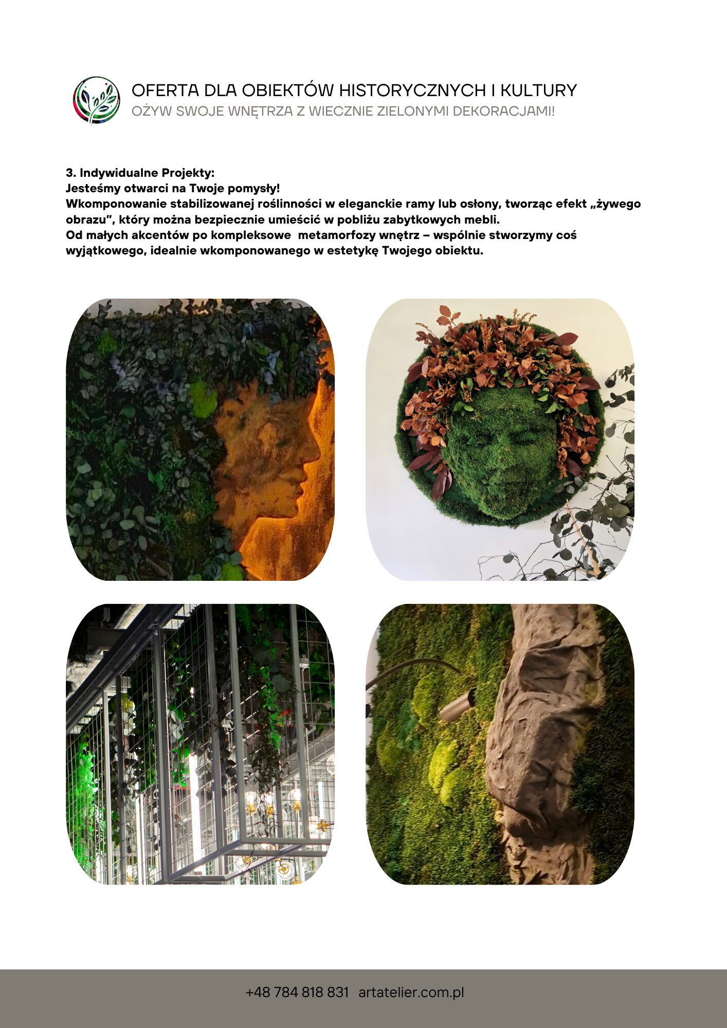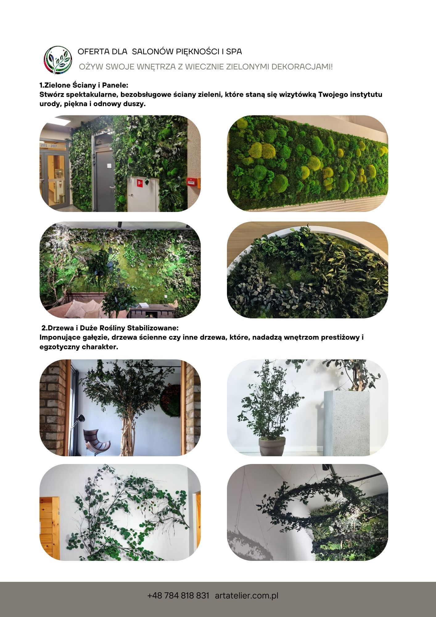 Obrazy z mchu, panele i logotypy z roślin stabilizowanych przyciągają wzrok i budują tożsamość miejsca. Kontrasty kolorystyczne, różne faktury mchu i liści pozwalają tworzyć dekoracje od subtelnych po bardzo wyraziste.